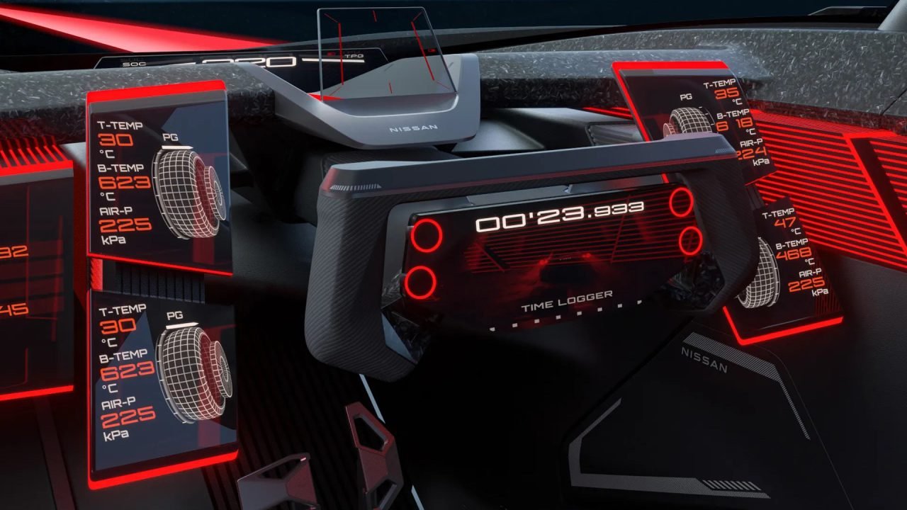 Peak power from the concept’s electric powertrain registers at 1,341 hp, or 1,000 kw. There’s also an all-wheel-drive system controlled by an advanced version of the Nissan e-4orce electric torque-vectoring system, plus a solid-state battery. Solid-state battery cells have the potential to reduce the weight of an EV’s battery while improving range and charge times. It’s a technology Nissan is currently developing with a view for launch around 2028.