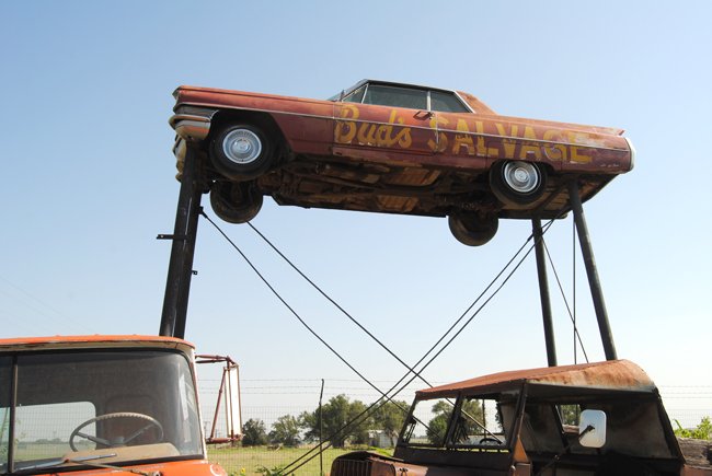 Bud’s Auto Salvage was established around 1955 by Bud Anthony who, with his wife Cordelia, has a close-knit family of three sons. Bud had a very good job working for the railroad, but being able to spend time with his family was more important and so using his mechanical skills, he opened a repair shop in which he built a stellar reputation. As a result of his efforts, a number of old cars began to show up at his shop, many of which were donated or traded for services. Bud soon found there was a need for parts from these vintage cars and began a side business. In short order, the parts side of his business exceeded the repair work. By the mid 1960s, Bud’s little operation had outgrown his in-town operation, so a parcel of land off Oklahoma Route 8, just outside the city limits of Aline, was established under the name Bud’s Auto Salvage. A couple of landmarks were created to identify the business, the most striking being a 1964 Cadillac Coupe deVille mounted high atop two metal posts.