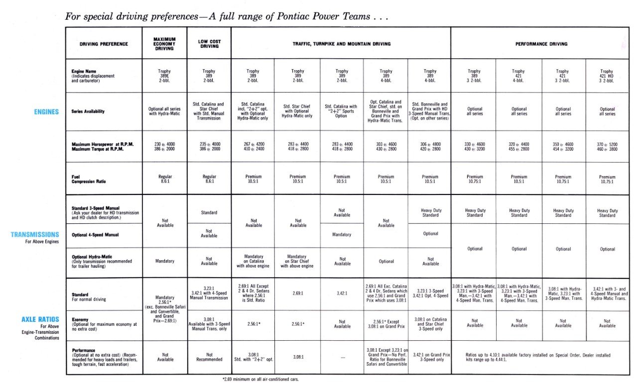 Like all Pontiacs, the Catalina Safari’s standard engine was a 389, though the state of tune is what distinguished the Catalina from pricier models: 235 horsepower with the standard three-speed manual, or 267 horsepower if Hydra-Matic automatic transmission was opted; the latter required premium fuel, though the 230-horsepower Trophy 389E was available for those who wanted regular fuel and an automatic.