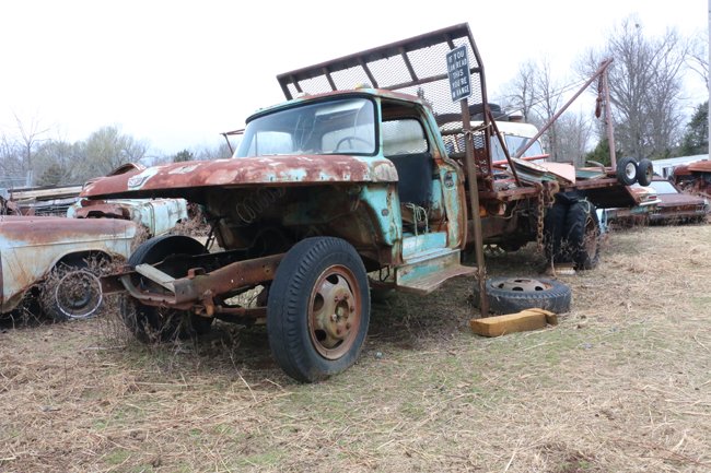 A parted-out 1966 F600 Ford boom truck brought many vehicles to the yard, and has also taken some of them to the recycler.