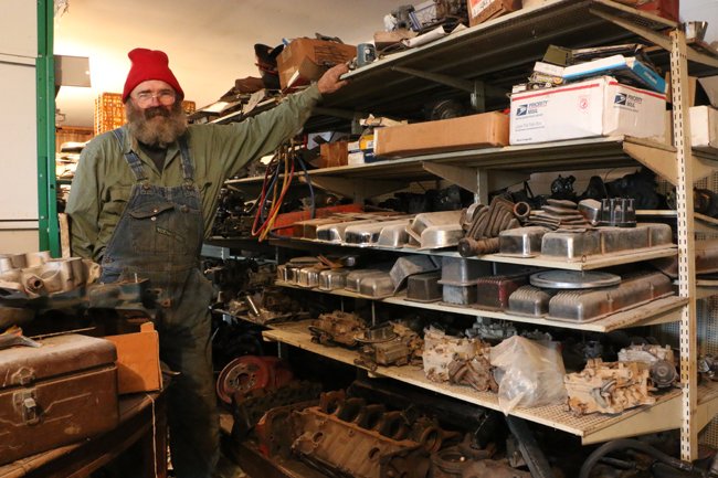Randall Watts poses by shelves loaded with used parts such as intake manifolds, carburetors, valve covers plus much more.