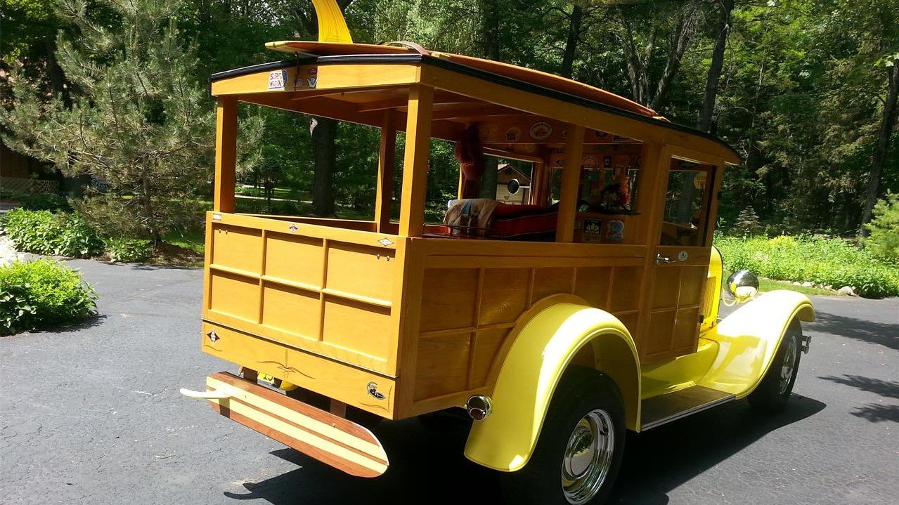 The Model A replaced Ford’s popular Model T and had a lifespan which ran from 1928 through 1931. Pricing at the time ran from $385 to $1,400, and body Model A styles were available in variations including sedans, coupes, panel trucks, cabriolets, and more. This Woody wagon features dual-bar bumpers, a chrome radiator shell, running boards, chrome hubcaps, and – of course – the surfboard mounted on the rooftop. A wooden plank that serves as a rear bumper is also designed in the shape of a surfboard.