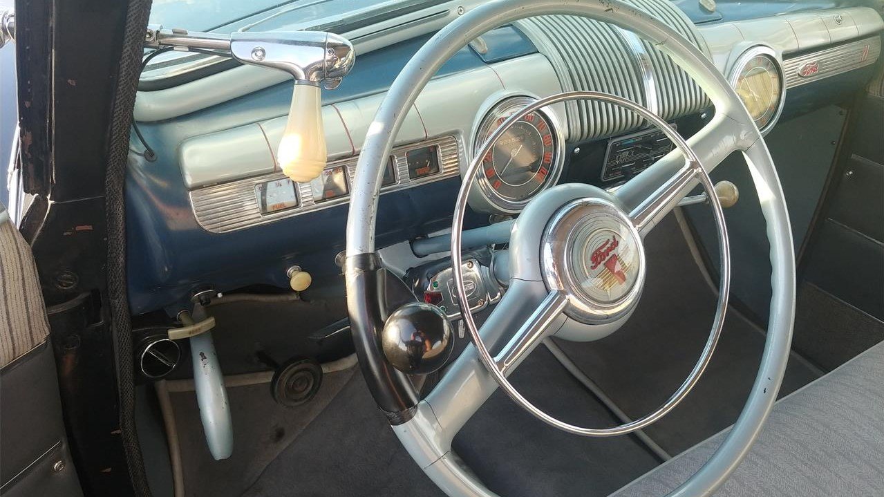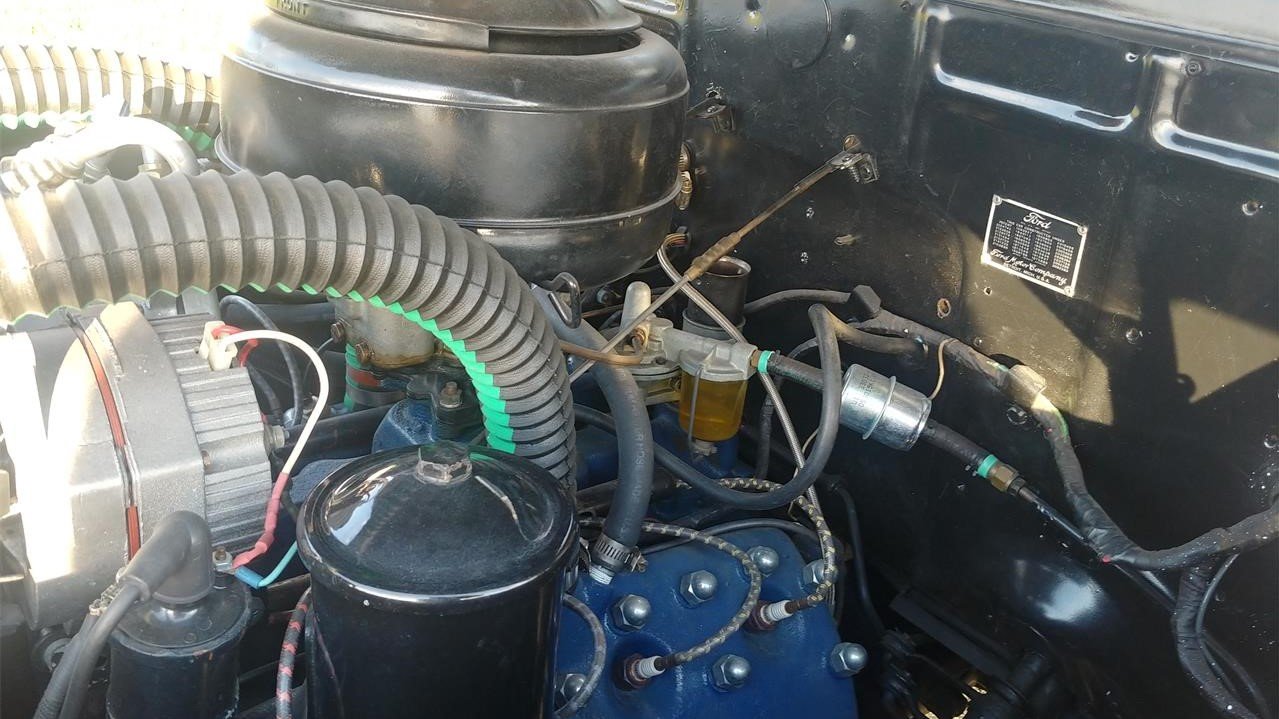 Under that hood, power came from a 239cid flathead V8 paired with a manual transmission. The motor on today’s feature car is said to be unmodified, although the electrical system has been upgraded to 12 volts and a Walker heavy-duty radiator was installed. The period-correct Coker Classic wide-whitewall tires have reportedly driven only about 50 miles since installation.