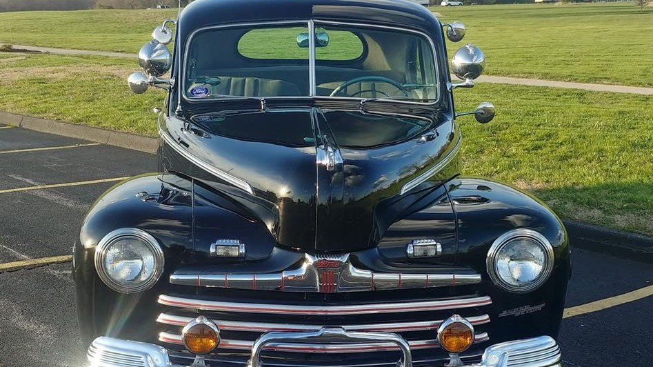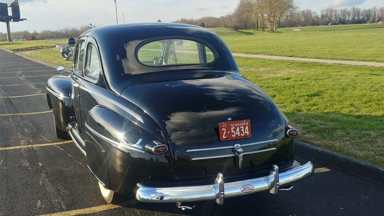 Post-World War II automotive production re-started in late 1945. The engineering for 1946 Ford models was largely a carry-over from pre-war in 1942 at the time, although the grille was revised, and the nose of the car was accented by inlaid red accents in the brightwork. The hood was slightly widened as well, and it received a center chrome strip to differentiate it from prior years.