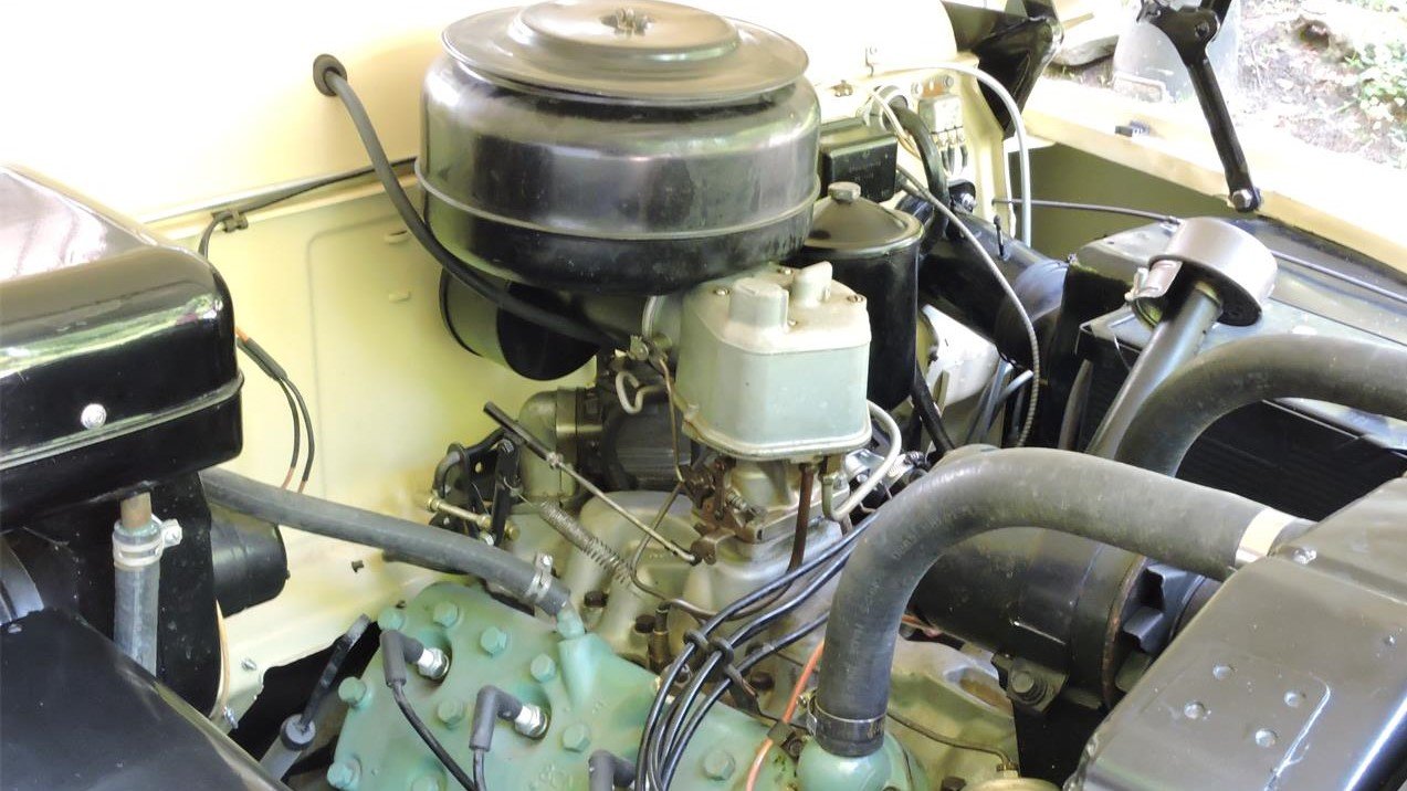 Under the hood, momentum comes from a 225cid Ford flathead V8 that was rated at 112 horsepower and 206 lb-ft of torque. The engine breathes through a Holley two-barrel carburetor, and power is sent rearward through a Ford-O-Matic automatic transmission.
