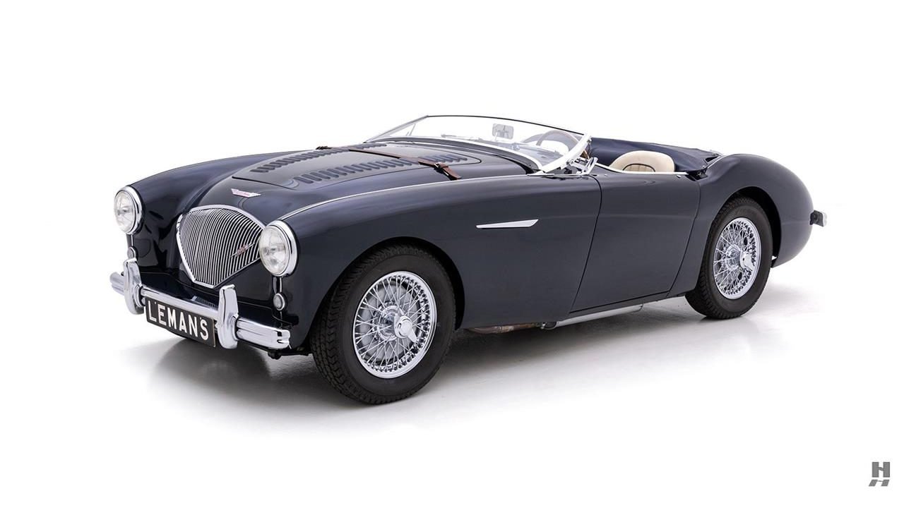 Of all the classic British sports cars, the Austin-Healey 100 series are about as classic as you can get. Sure Jaguar XK120/140/150 are all more popular and more expensive as well, but the Healey 100 cars are in my opinion more of a pure sports car that any of the Jags. They are lighter, somehow have a bit more interior room that a XK120, are also smaller, and handle better. They do not have the exquisite twin cam engine under their bonnet but the big, almost 4-liter, 4-cylinder engine has ample power and sounds almost as good as the engine in the XK Jaguar. If that were not enough, the Healey 100 was a strong competition car in its time, and it ran successfully at events including Sebring and the 24 Hours of Le Mans. This all adds up to my idea of a truly great British sports car that is still pretty affordable. The Healey 100 got its name as it was able to go 100 mph. This was a big deal in the 1950s, and not only can it go that fast it is stable at that speed. In fact the competition cars were able to cruise at speeds much higher than 100 mph, which led to their success at racing events.