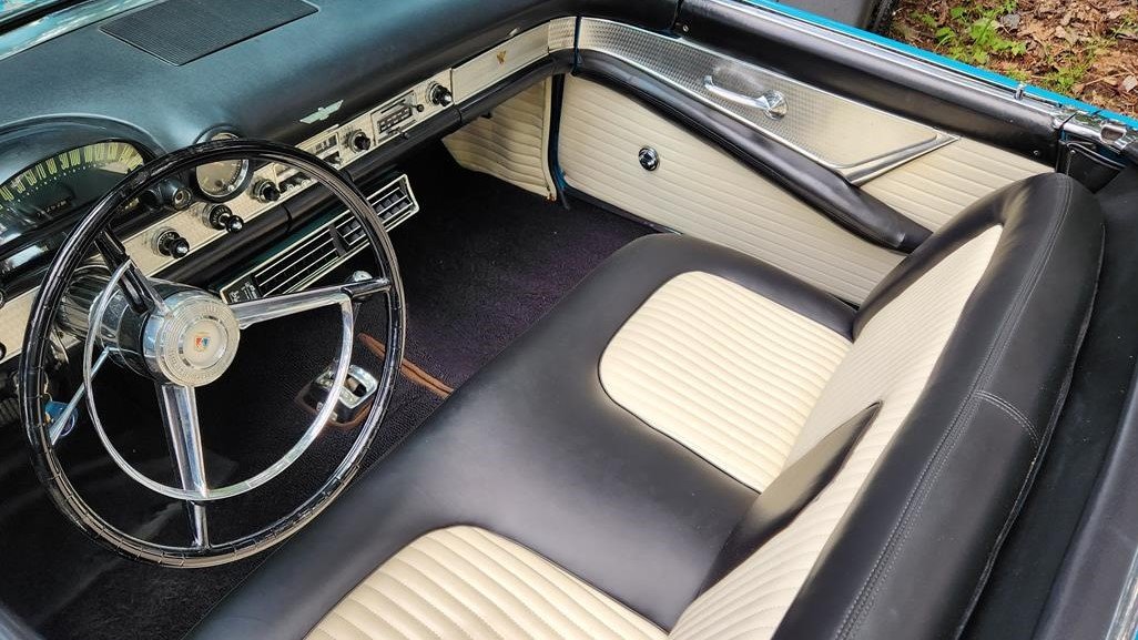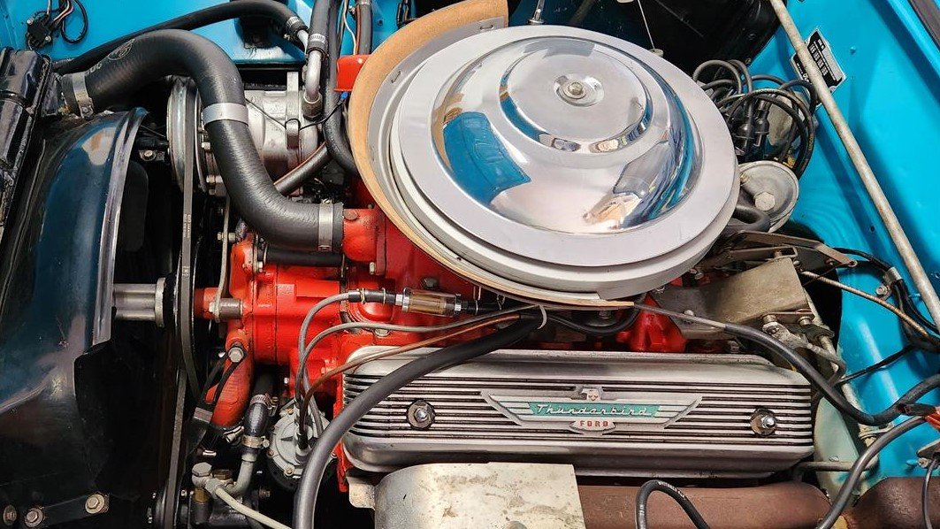 Under the front-hinged hood lives a four-barrel 312cid Y-block V8 paired with a floor-shifted three-speed Ford-O-Matic automatic transmission. The powertrain was good for 225 horsepower and 324 lb-ft of torque, so even as “luxury” car, the Thunderbird could still move with authority.