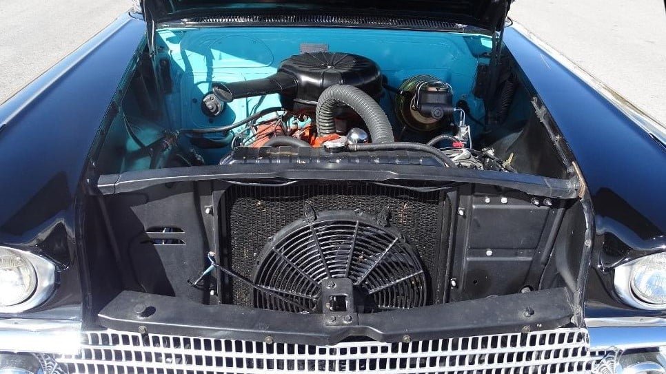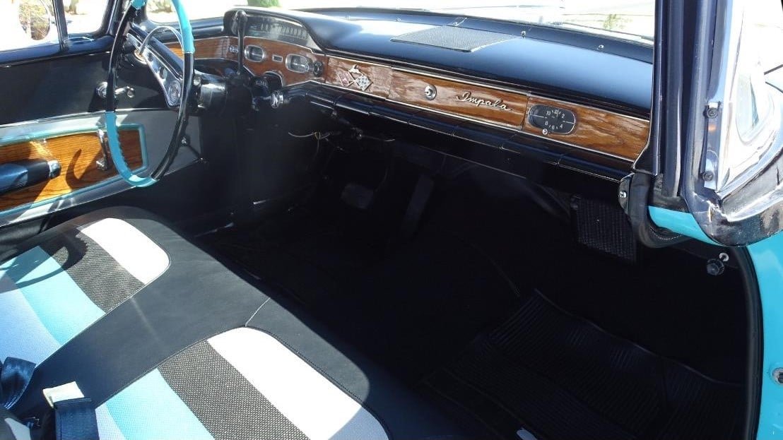 This restored two-tone Impala is nicely finished in turquoise and black, and the color scheme carries through to the interior with a particularly eye-catching tri-tone black, turquoise, and white pattern in the bench seats. The car’s sweeping side profile is accented with rear wheel skirts, and the entire body is adorned in loads of brightwork as it should be. Tucked beneath the rear bumper are dual chrome exhaust outlets, which we get to hear in action thanks to the video Gateway provided.