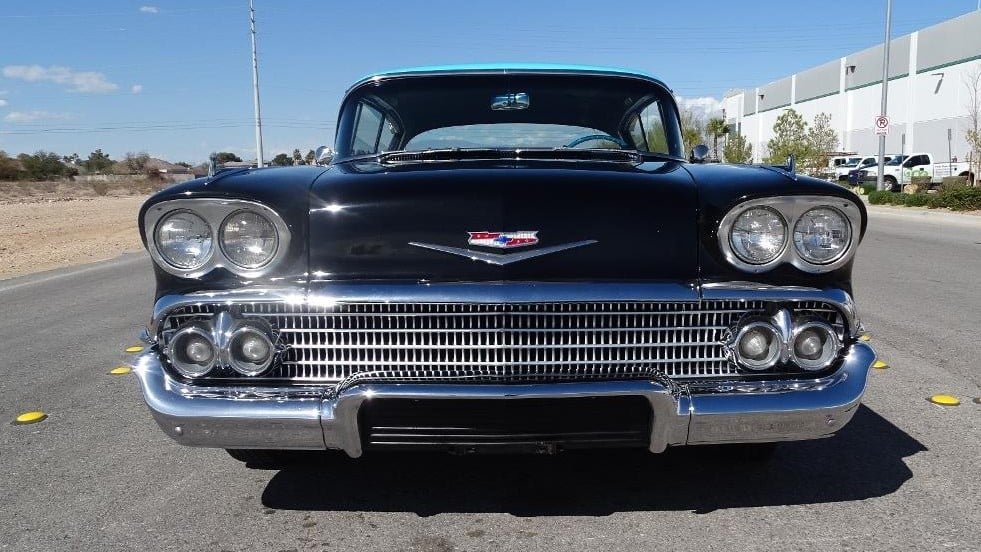 The rise and fall of tailfins took place in the years that followed, and in 1958, General Motors launched a one-year-only design for the Bel Air on the B-platform that was longer and lower than previous models. Notably, the front end received quad headlights and the rear took on round taillights in alcoves at either side. The “Impala” name was first seen that year, and it was applied to top-tier two-door hardtop Bel Air models.