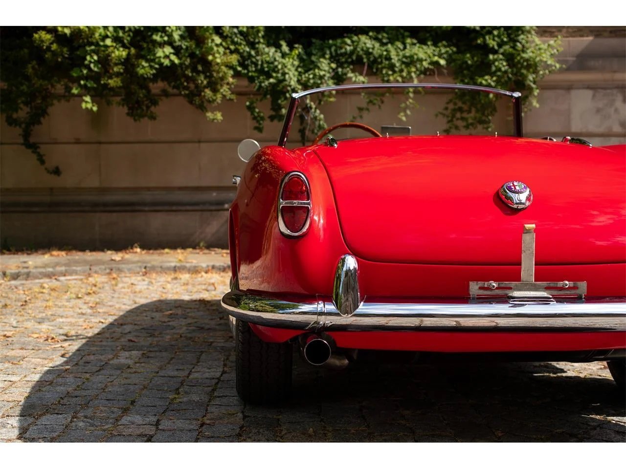 This 1959 Alfa Romeo was born a white Giulietta Spider Veloce in Milan on January 3, 1959, and sold through the famous Hoffman Motor Car Co. in Manhattan. In the 1990s, the Alfa was sent to Ashcroft Restorations in Phoenix for an interior refreshing. The exterior was repainted a shade of BMW red by the owner, who owned Day BMW in Concord, California.