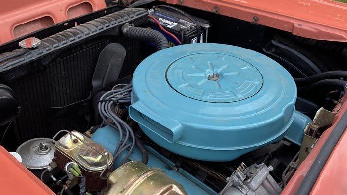 The paint for this two-door was redone in the original “Geranium” (code T) color with a complementary Colonial White (code E) roof during restoration in 1999. The body is said to be rust-free since the car was Arizona-owned long term. Mechanical areas of attention at the time included the tires, water pump, battery, solenoid, a re-cored radiator, seals, hubcaps, radio, antenna, and interior.