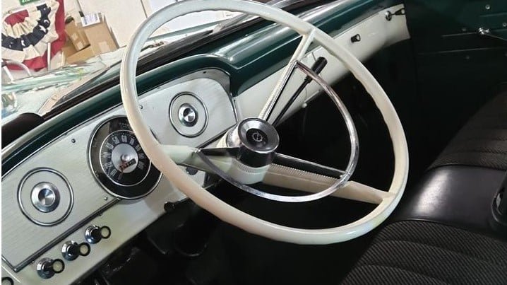 This Holly Green-finished 1961 stepside shows well, featuring a straight body and complementary red steel wheels with polished center caps and trim rings. The doors have “Custom Cab” scripted badging, and the cargo area is lined with wooden planks and stainless-steel hardware. “The truck shows great and gets a lot of attention at shows and cruise-ins. It had a restoration about seven years ago in Tampa. Not a frame-off. Very minor rust,” the listing states.