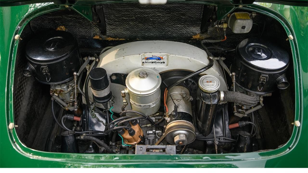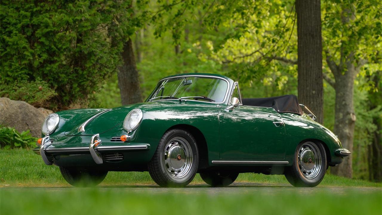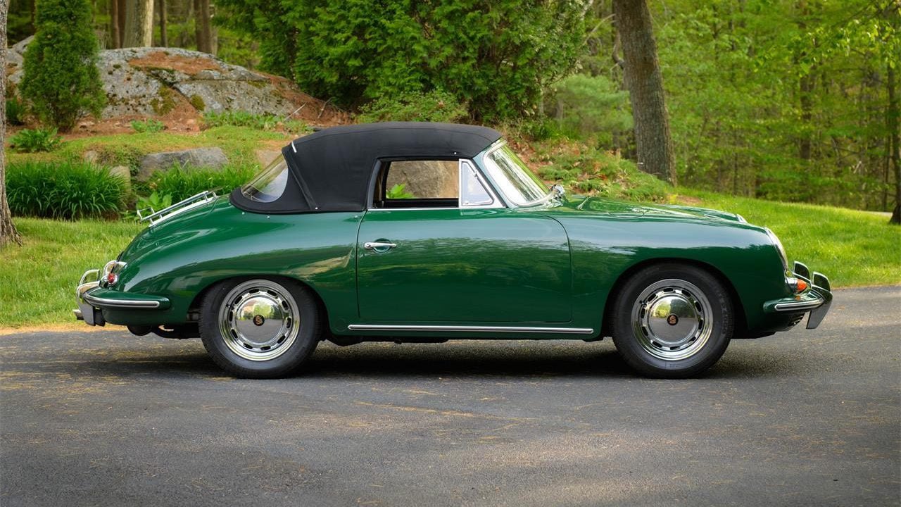 According to the seller this 356C cabriolet is a local resident of the Boston area since new. It was delivered to first owner Ethel Carney of Brookline, Massachusetts, on September 9th, 1964. They add that little is known about the history of the car until their sales team purchased the car locally in 2022. The car is in its original colors of Irish Green paint over a Black interior, and it retains the matching engine and transmission. They add that this 356 has recently received a mechanical tune up and is in good running and driving condition. They add that a compression test shows results between 125-130 psi on all four cylinders.