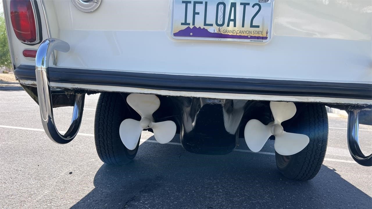 The engineering for the Amphicar is rather fascinating: Power comes from a rear-mounted, Triumph-produced 1,147cc inline-four mated to a four-speed manual transmission spinning the rear wheels. There are also two propellers at the rear capable of either forward or reverse direction. When submerged, the car is capable of going seven knots (or eight miles per hour), and it maxes out at roughly 70 miles per hour on land. Owners say that it cruises comfortably at 65 on the highway.