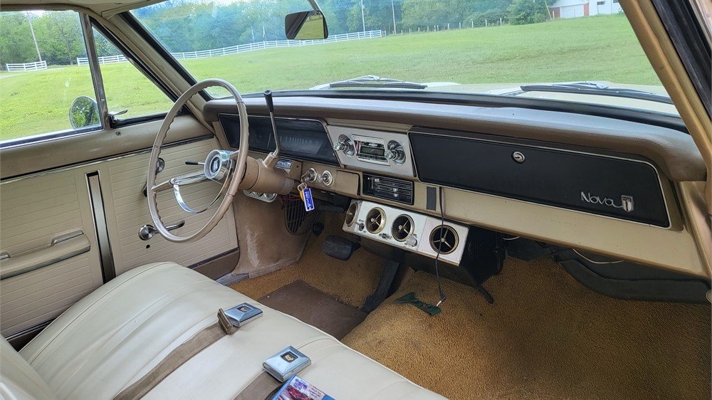 The compact Chevy II model rolled on the General Motors X-body platform and was introduced in 1962 with many body styles available. A second generation launched in 1966 with revised features including a semi-fastback roofline, vertical taillights, and squared-up overall aesthetics. This Cameo Beige hardtop from 1966 looks to be well-preserved, sporting a set of Rally wheels on BFGoodrich tires. Power under the hood comes from a 283cid V8 connected to a Powerglide two-speed automatic transmission. Moving to the inside, we see a stock-looking cabin with an under-dash air conditioning unit, auxiliary gauges, and a radio.
