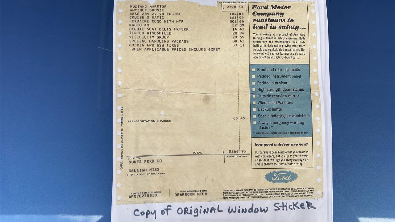 “Local Mississippi Mustang owned by the same family since March 1966,” the listing states. “Originally painted Antique Bronze by Ford, now wears a beautiful custom blue finish named by the restoration shop: Mississippi Blues.”