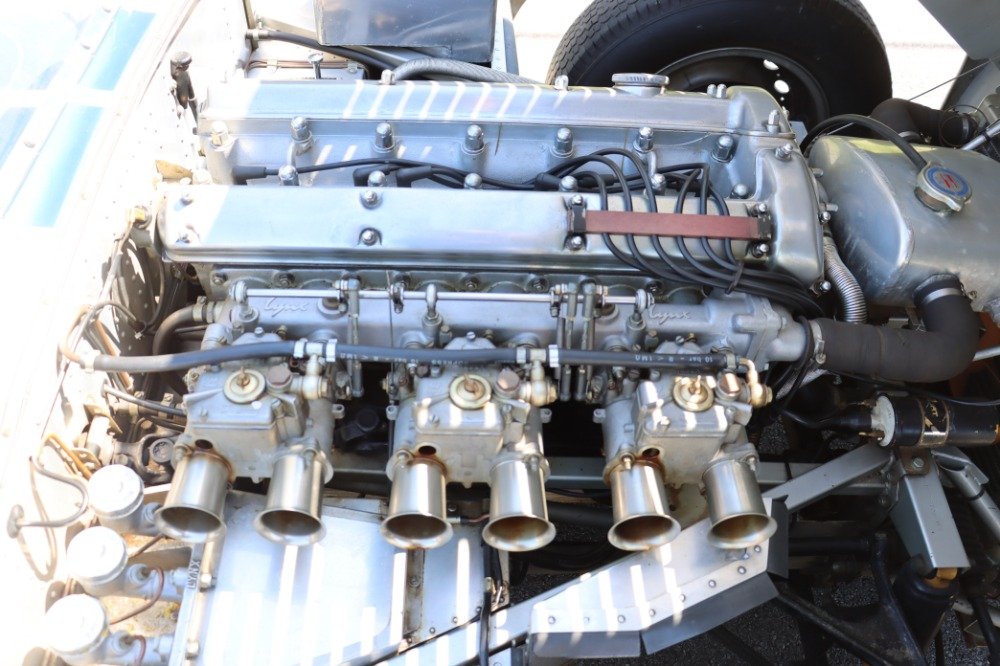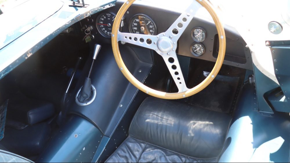 The car rides on Dunlop-style aluminum peg-drive wheels with three-eared knock-offs and clad with Dunlop racing tires. The car has twin brake master cylinders actuate disc brakes all around, with the rears mounted inboard of the independent suspension. The split cockpit features seating for two trimmed in blue leather as well as aluminum surfaces painted to match the body stripes. Equipment includes Luke four-point harnesses, a driver’s headrest, a rearview mirror, a fire extinguisher, and aluminum tonneau cover that fits over the passenger seat. A wood-rimmed steering wheel sits ahead of a black dash housing Smiths instrumentation including a 180-mph speedometer,  tachometer, coolant temperature, and oil pressure gauges. The five-digit odometer shows 21k miles, approximately 5k of which have been added by the current owner.