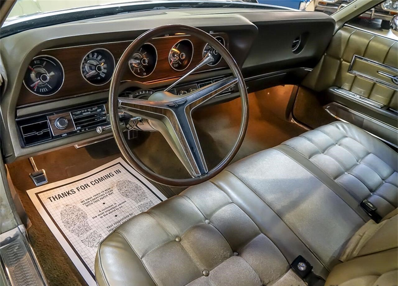 Interesting options for the new two-doors included the Special Brougham Option, which featured high-back bucket seats, center console, three-spoke Rim-Blow steering wheel, cut-pile carpeting, rear center armrest, door pull handles, and courtesy lights; outside, you’d find auxiliary grille lamps (not unlike those on a Mercury Cyclone), color-keyed stone shield, radial whitewalls, color-keyed wheel covers, bodyside moldings, and wheel lip moldings. New for 1971 was the Cayman grain vinyl roof, which was available in blue, green, brown, white, and black.