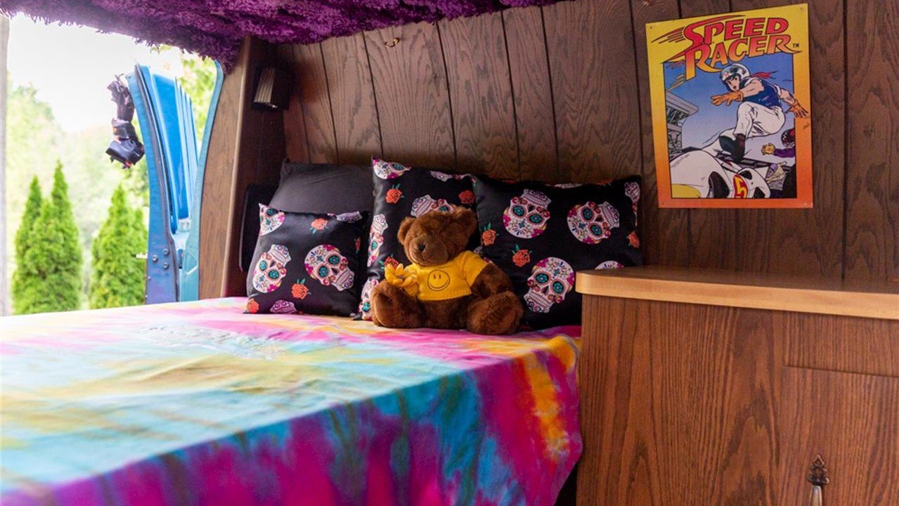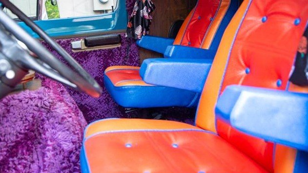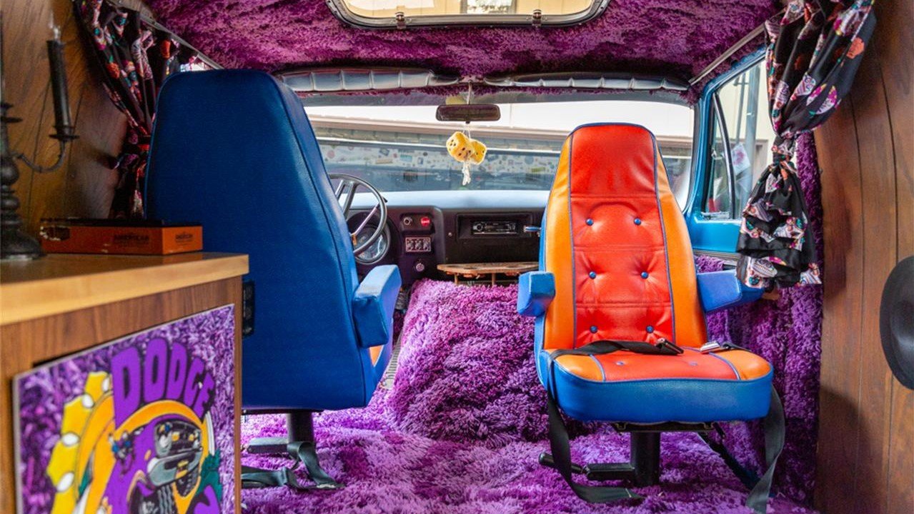 It takes a few minutes of viewing the photos to soak in everything that’s going on with that psychedelic cabin. The upholstery and carpet are about as eye-catching as they can be; plush, purple shag carpeting adorns the floor, front door panels, and even the headliner. The walls are covered in period-correct woodgrain paneling, and the bed is dressed in a tie-dye-themed blanket. Additional upgrades include auxiliary battery power for the available plug outlets, storage compartments, a sunroof, and tinted windows.