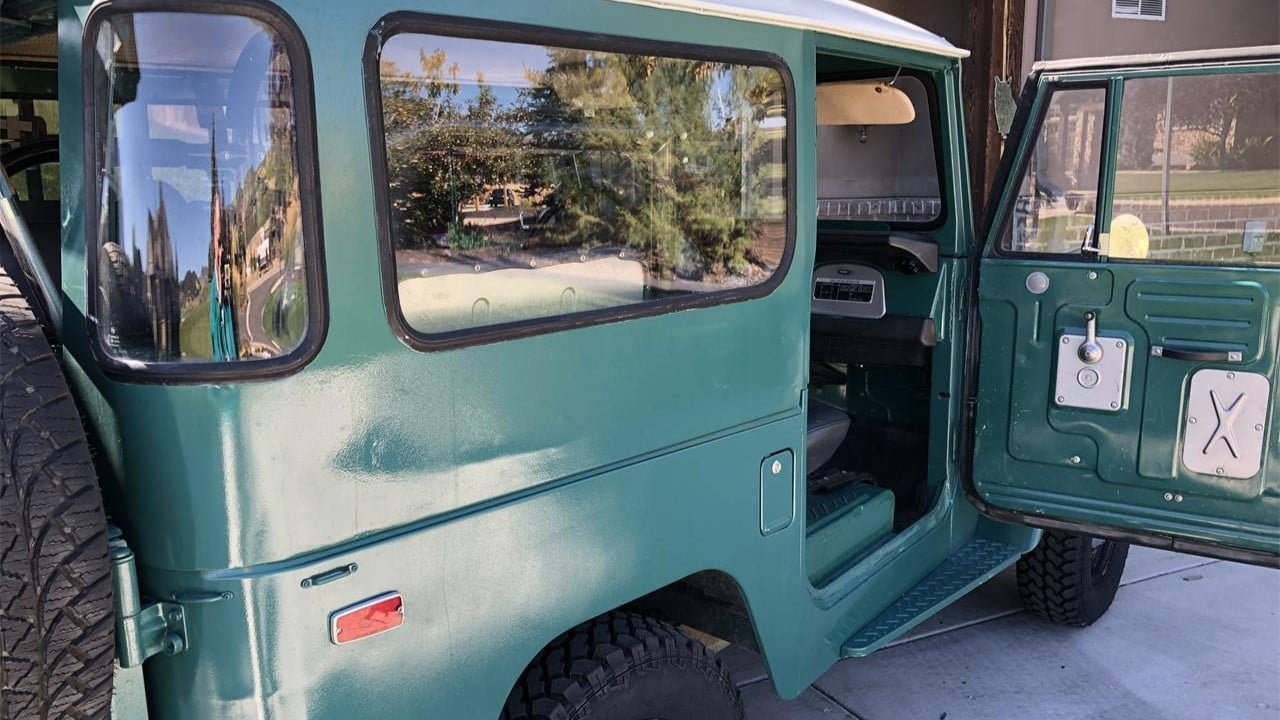 The body looks to be straight, and it appears the vehicle may have had a respray at one point. Referencing some production data for the 1974 FJ, that there were a number of variations of green colors including Breathe Green, Deep Green, Judson Green, Nebula Green, and Rustic Green. The rear end has a unique access design: It is accessed via short barn-style doors at the bottom and a flip-up window up top, and the cargo compartment holds dual inward-facing vinyl jump seats.