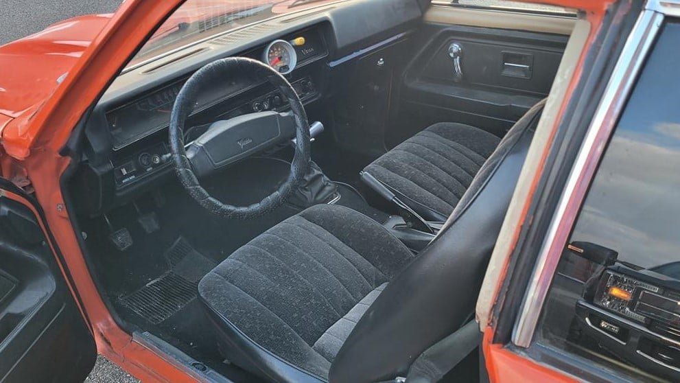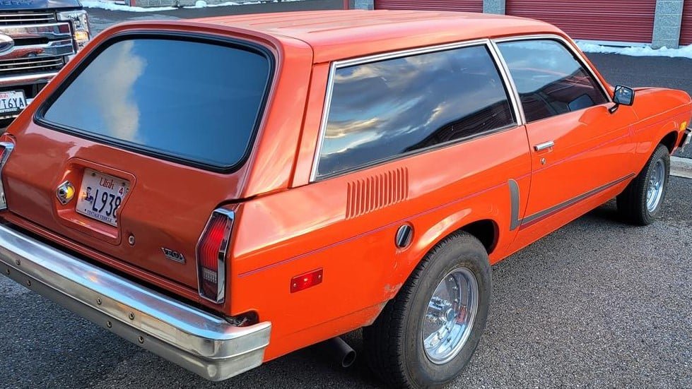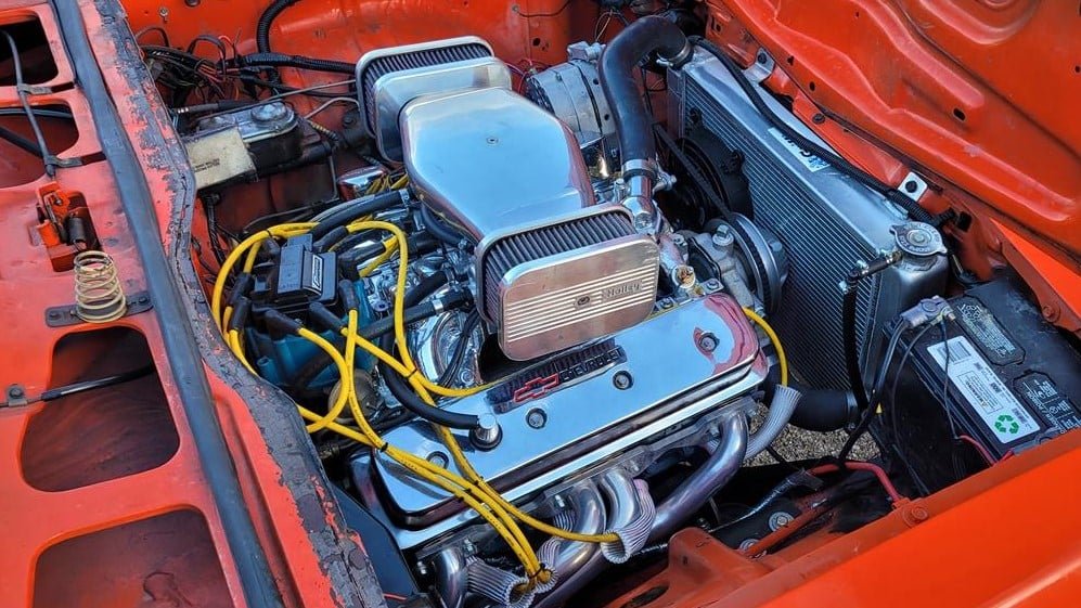 Some of those upgrades include a Holley Sniper carburetor, a roller cam and rockers, Sanderson headers, and a four-speed manual transmission. This Vega might qualify as a “sleeper,” but that eye-catching orange paint and the chrome wheels are pretty good hints that something special is going on under the hood.