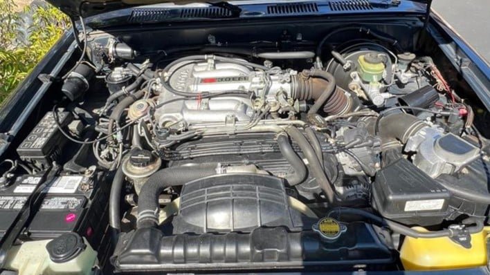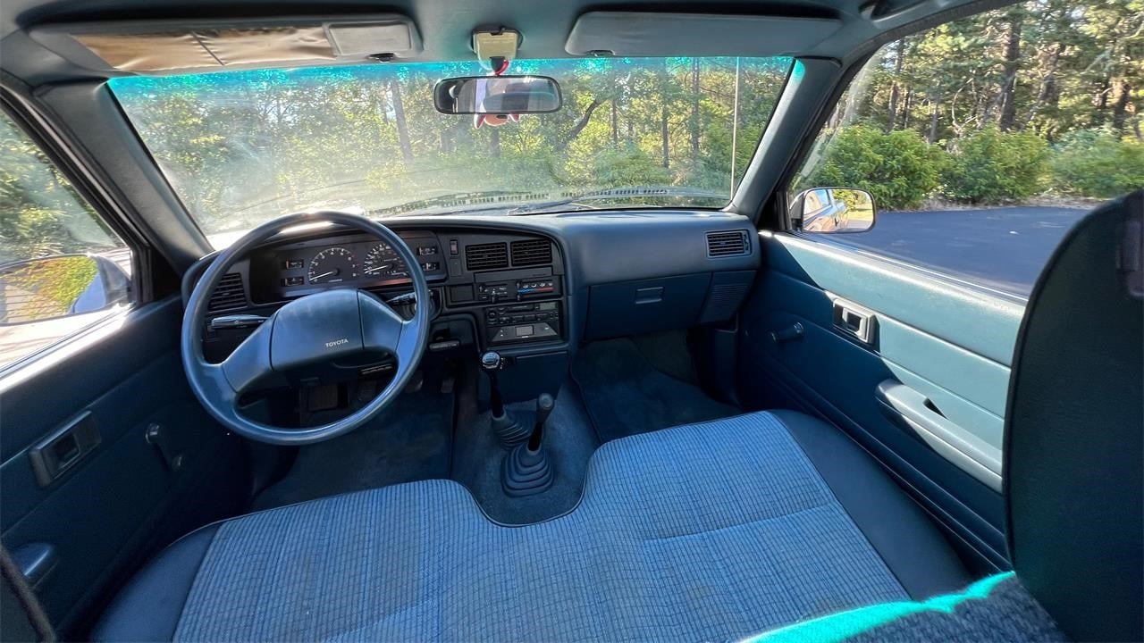 The truck looks well-kept for being over 30 years old, and even the interior of the cargo area has been protected by a rubber mat. Toyota pickups from this era were known for their pin striping, and this regular-cab truck has a blue metallic paint finish topped by subtle turquoise and pink graphics – how very 1990s!