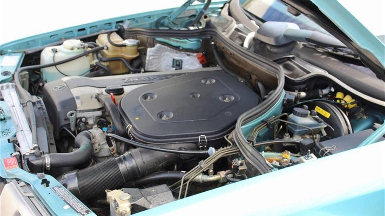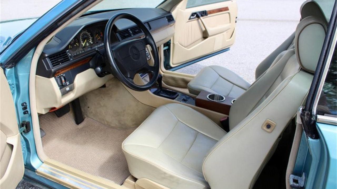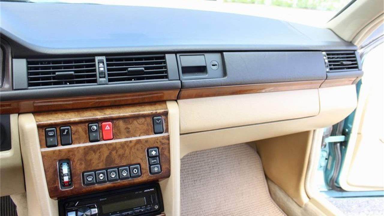 This 300CE is painted in a period awesome color of Petrol Blue Green Metallic over a Beige leather interior. Both the interior leather and the paint on this car look to be original, despite it having covered 118,000 miles from new.