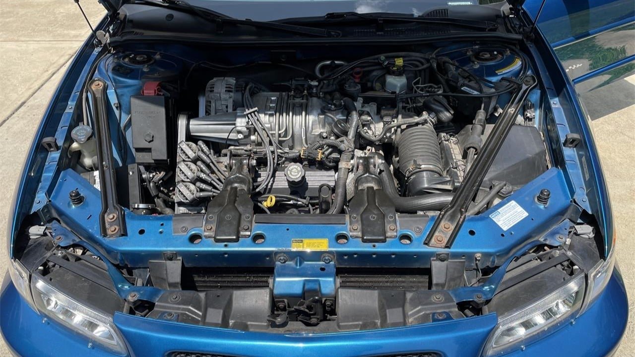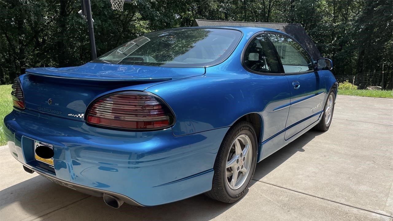 Showing 98,268 original miles, this Gulf Medium Blue Grand Prix coupe looks well-kept overall. The checkered-flag decals on the sides and rear are subtle clues that this car is something a little special. The Grand Prix was initially born in 1962 as a grand-touring coupe on the General Motors B-body platform and lived through eight generations and various body styles before being replaced by the G8 sedan. This car comes from the seventh generation which launched in 1997 on the W-body with assembly taking place in Kansas City, Kansas. Design language was unveiled at the January 1996 Detroit Auto Show, and one of the key talking points revolved around its “wide track” engineering. Television commercials for the car used the tagline “wider is better.”