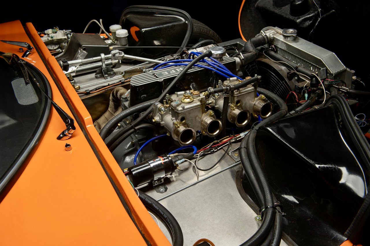 “This example has been fitted with a replacement body that was sourced from Marcos Engineering, Ltd. and painted in a Lotus orange.”