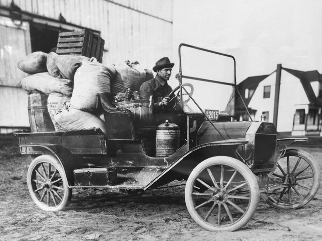 A. This photo has already appeared online, with various opinions expressed. Let’s take it step by step: It’s obviously a “Brass T” Ford with brass radiator (and lamps, if it had them, but we can see it doesn’t). That dates it as before 1917, when radiator and lamps became black-painted steel. The front fenders do not have a curved profile ahead of the axle, which makes them post-1910. The “straight” fenders in 1911 and 1912 had a “bill” on the leading edge, which these do not. According to Bruce Macauley’s definitive “Model T Ford: The Car That Changed the World,” the bill was eliminated in 1913, then reinstated during 1914. This makes the car a 1913 or early ’14.