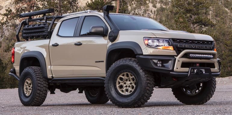 Authorities in the US – the world’s biggest market for pick-ups – have less stringent rules regarding vehicle ride height and tyre size. As these images from previous SEMA auto shows demonstrate (above and below), modified utes in the US are also allowed to have tyres that protrude beyond the width of the body, which is illegal in Australia for safety reasons.