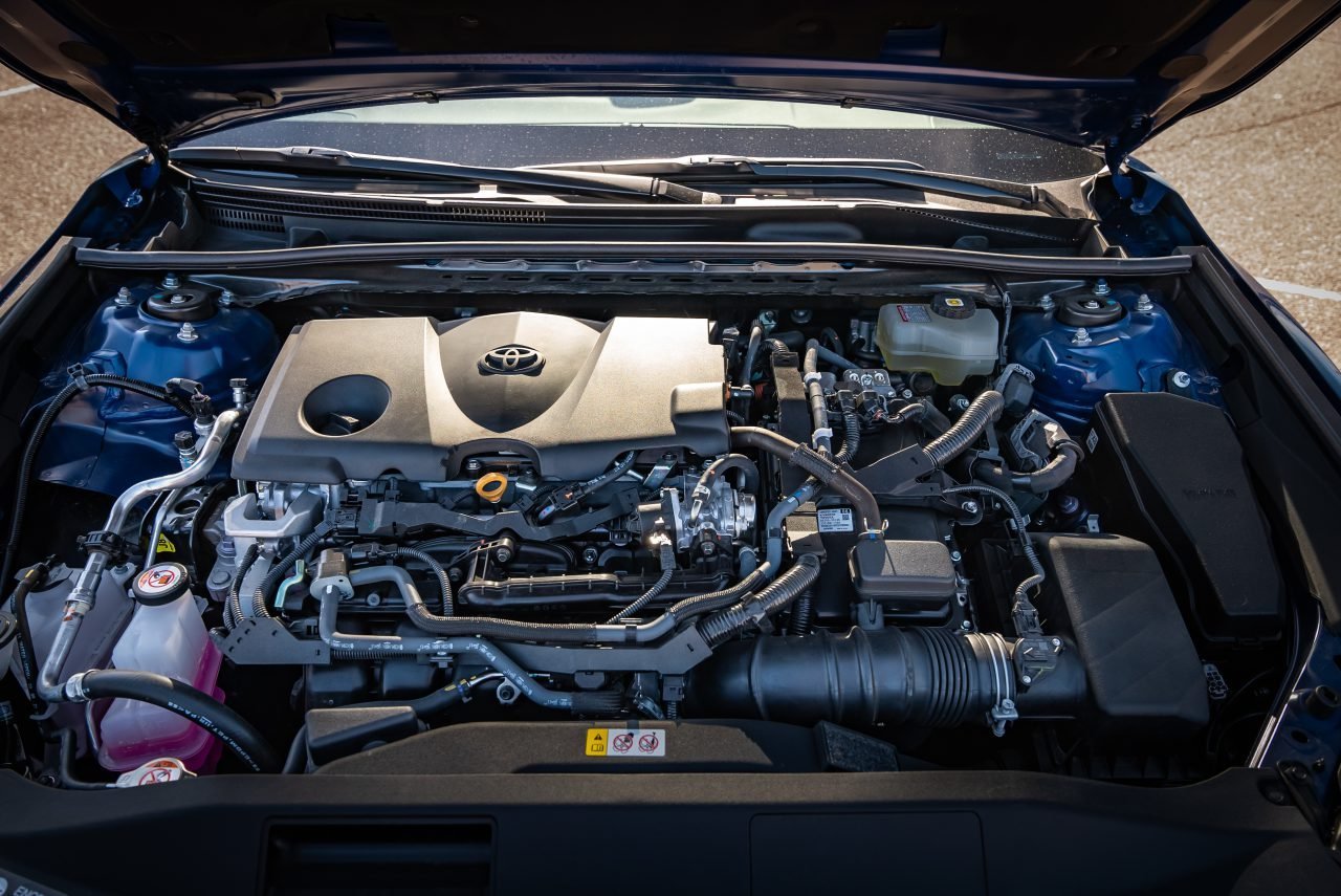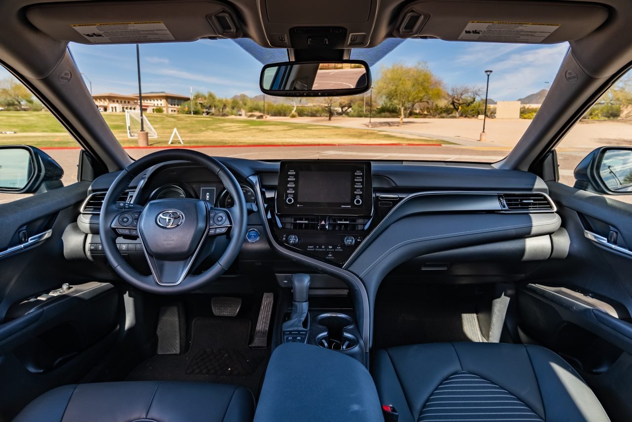 Our SE Hybrid Nightshade was furnished with Sport SofTex-trimmed front seats with fabric inserts. It’s a durable imitation leather that appears across the Toyota spectrum, but it lacks a luxurious look and feel. On the SE Hybrid Nightshade, the driver-side seat is power-operated and includes lumbar support; the passenger makes do with manual controls that is just fine with us. Otherwise, our Camry came with most of the conveniences you’d expect in a modern sedan, such as remote keyless entry system, push-button start, USB-C port, dual-zone climate control and, typical for modern cars, a busy, 4.2-inch multi-function display between the speedometer and tachometer. We do like the knobs used for volume and tuning and, of course, if you prefer buttons, you have the steering wheel to adjust volume and a whole bunch of other things. The infotainment system is straightforward and not too difficult to pair with your phone, especially for those adept at setting the clock on a VCR.