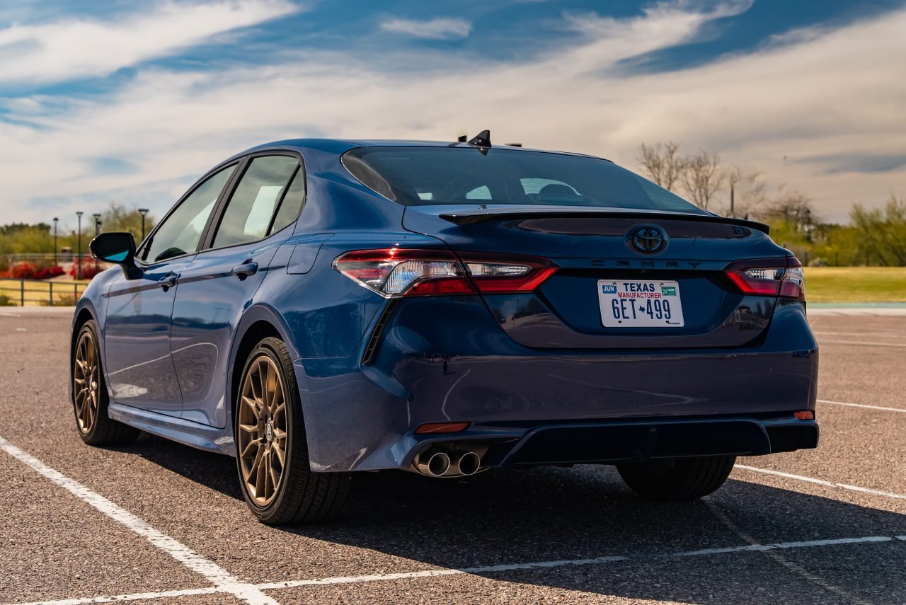 When the current-generation Camry debuted for 2018, it was somewhat of a revelation because Camrys of the past had been so deliberately milquetoast. Though styling is obviously in the eye of the beholder, the new Camry certainly came off appearing much sportier than it had done in the past. Within the Camry series, different trim levels may feature different styling (especially up front), with some appearing more polarizing than others. In the case of our Camry SE Hybrid Nightshade, it features a “black front grille with sport mesh insert” complemented by black side mirrors, window trim, and badging. Nineteen-inch bronze alloy wheels set it off the Reservoir Blue nicely. Other trim levels feature more of a massive “chin” that the SE, XSE, and TRD manage to avoid. Perhaps the typical Camry target market will not care, but we may have a different opinion: the schnoz can also be polarizing depending on trim level, with some invoking the look that Acura was criticized for a decade ago.
