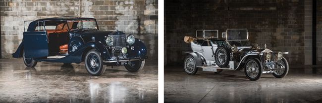 LEFT: 1938 Rolls-Royce Phantom III ‘Parallel Door’ Saloon, RIGHT: 1909 Rolls-Royce 40/50 HP Silver Ghost Roi des Belges. Photos – Darin Schnabel © 2019 Courtesy of RM Sotheby’s