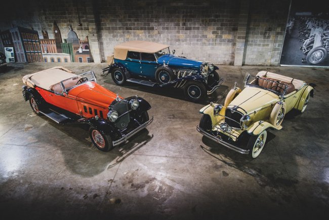 The 1930 Packard 734 Speedster Eight Phaeton, 1930 Duesenberg Model J Murphy Convertible Sedan, and 1930 Ruxton Model C Baker-Raulang Roadster which highlight The Guyton Collection. Photo – Darin Schnabel © 2019 Courtesy of RM Sotheby’s