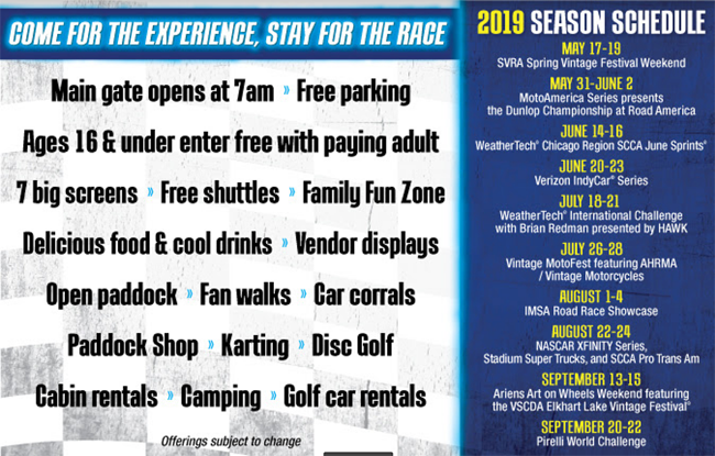 “Road America is known for having the most active schedule of any road race circuit in the U.S., and we look forward to hosting the MotoAmerica Series, INDYCAR Series, Pirelli World Challenge Series, IMSA WeatherTech® SportsCar Championship, NASCAR XFINITY Series, Stadium SUPER Trucks, the Sports Car Club of America and three separate vintage events in 2019,” said Kertscher. “The 2018 season was incredible and we encourage all our fans to get their season passes early and print their tickets at home, so they can enjoy another season of great racing and fond memories at Road America. Event tickets for the 2019 season and season passes are now available at the advance price and a season pass includes over 50 days of action. Anyone who is interested in camping can begin reserving sites starting November 7, plus we have several new cabins available for fans to stay on site and enjoy all the action, so check out www.roadamerica.com and start getting ready for 2019.”