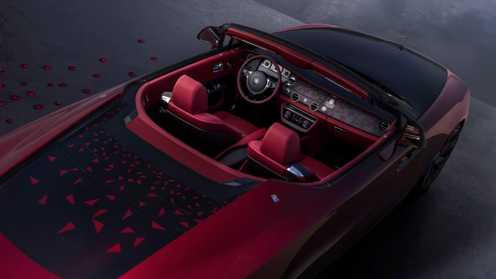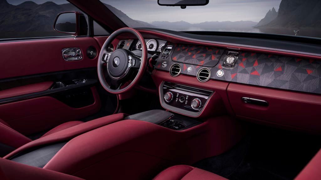 The cabin is highlighted by an intricate parquetry design made up of 1603 triangular pieces of Black Sycamore veneer, claimed to have been arranged to mimic fallen rose petals. Made by hand by a single Rolls-Royce craftsperson, the piece took nine months to complete.