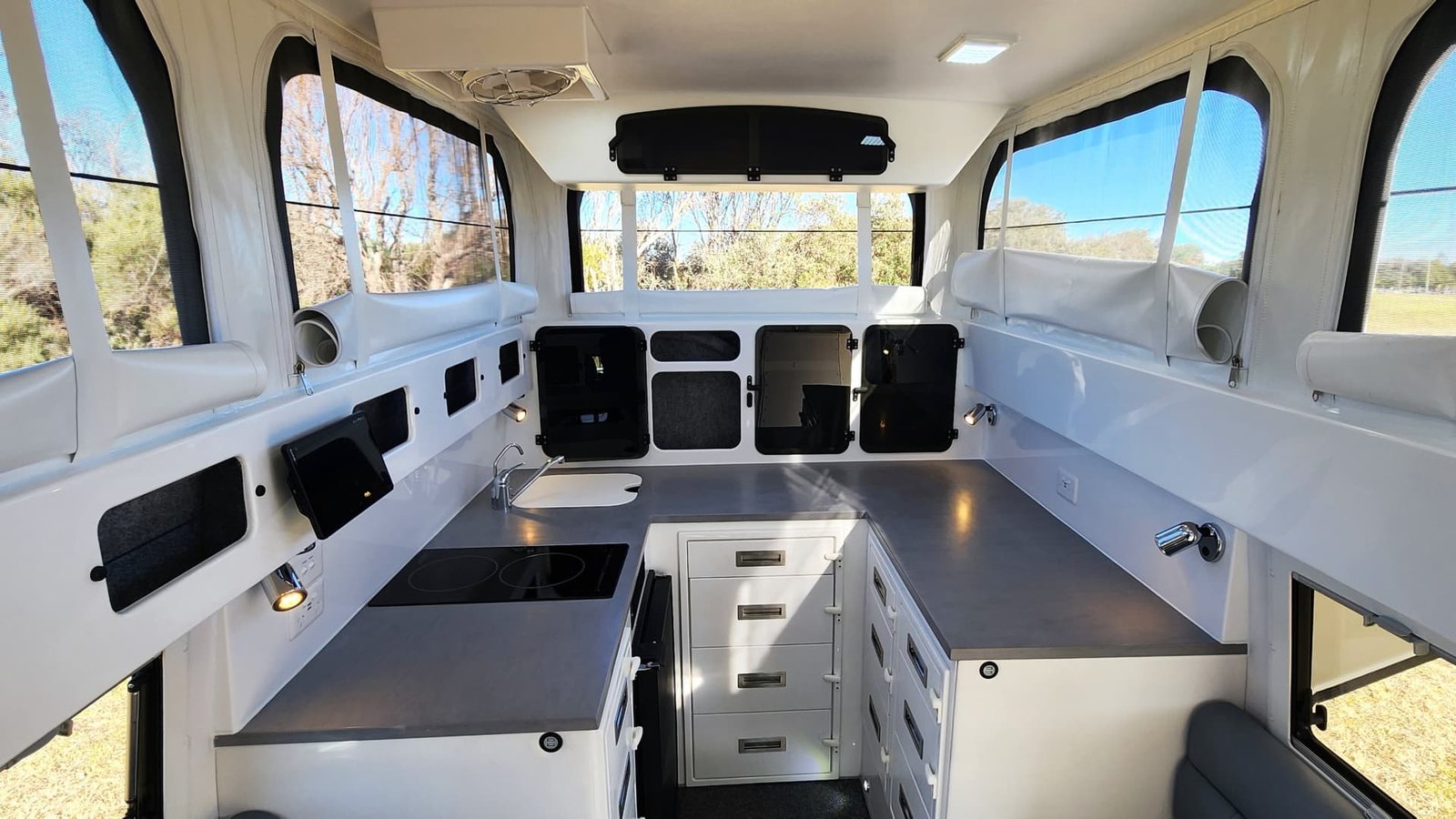 Having this much auxiliary power means the EarthCruiser goes completely without additional fuels (aside from diesel for the engine), with electricity powering your cooking and air conditioning needs, as well as water pumping and heating. This is also plumbed into a system to power things like an electric chainsaw and vacuum cleaner.