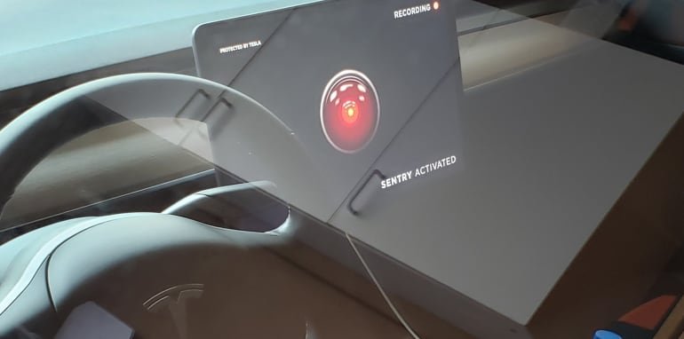 If something more severe (like a broken window) is detected, the car activates its alarm, cranks up the brightness on the centre display, and plays music at full volume through the car stereo. A picture of the ‘Alert’ stage is below, from Reddit user u/Spamium.