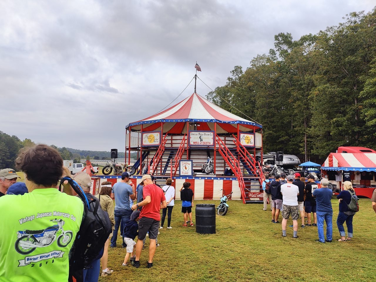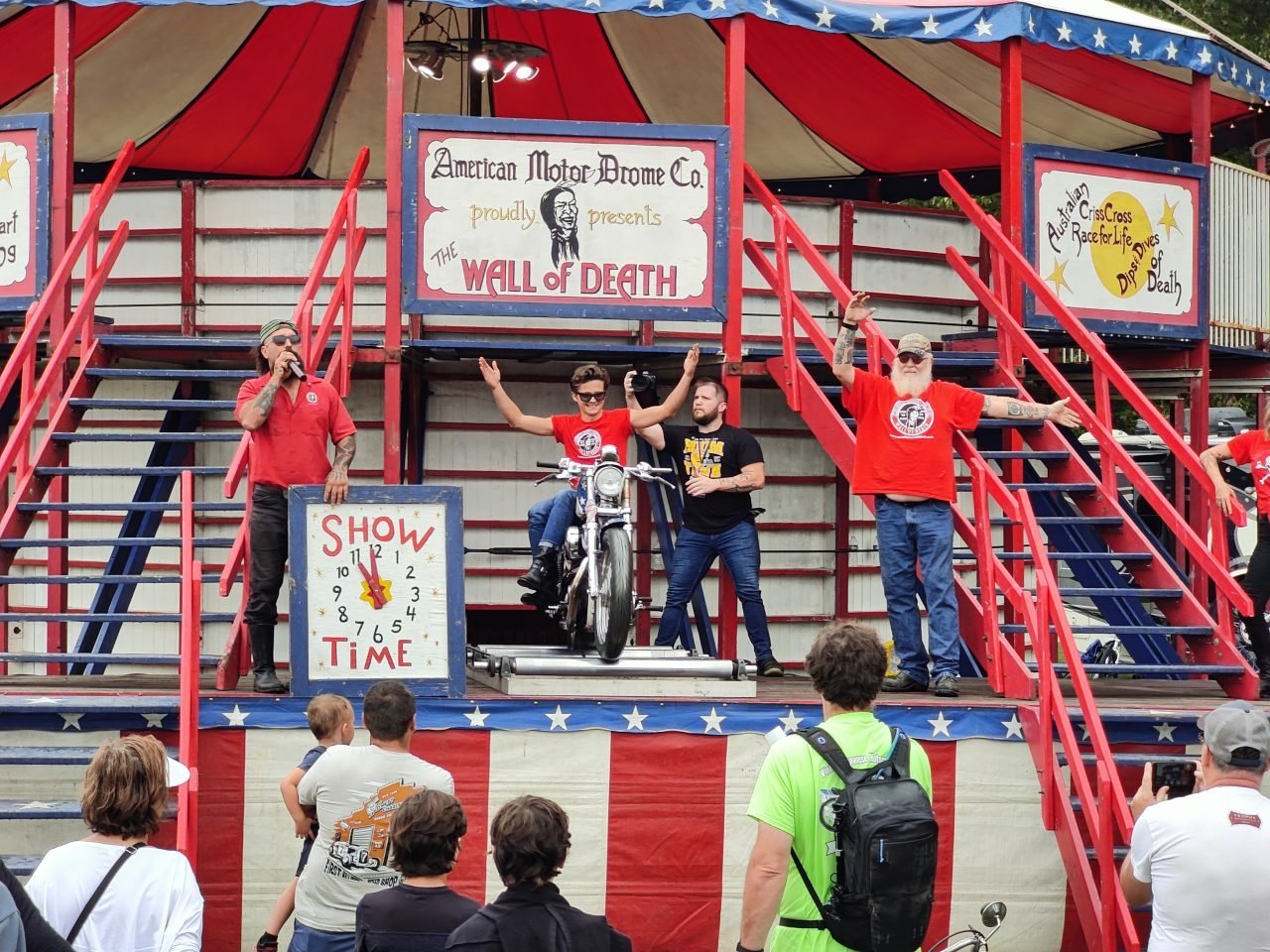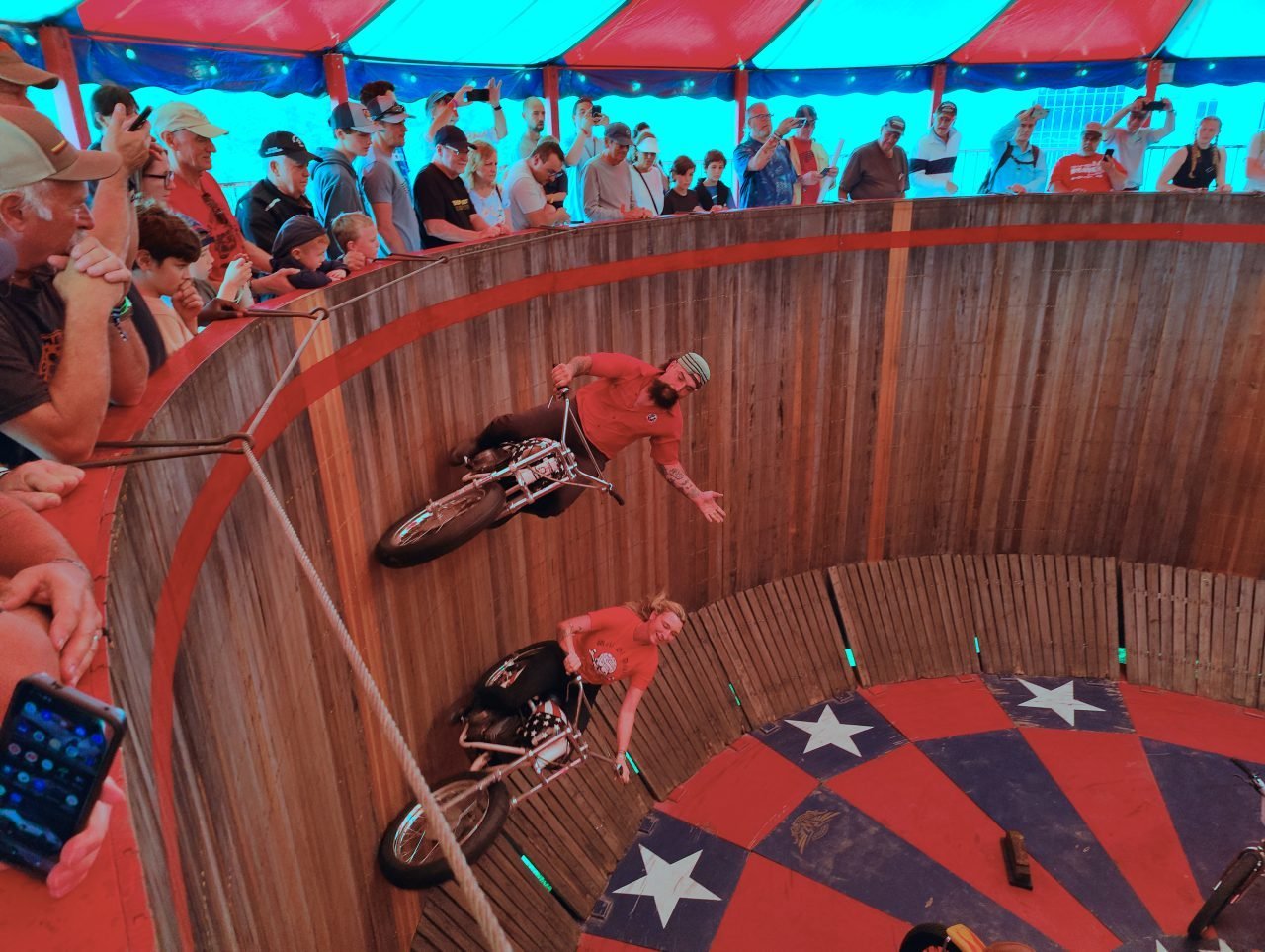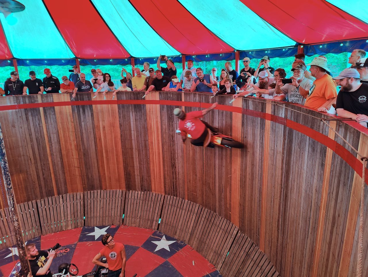 If you have never seen a Wall of Death show before it is where crazy professional riders drive around inside the walls of what looks like a big wooden barrel. These displays used to be quite common at county fairs around the country but have almost disappeared. If you get the chance to see one, do whatever it takes to do so.