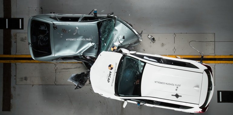 Crash test data showed the driver of the 2015-model Toyota Corolla, protected by seven airbags, would have survived the crash while the driver of the 1998 model would have suffered fatal injuries.