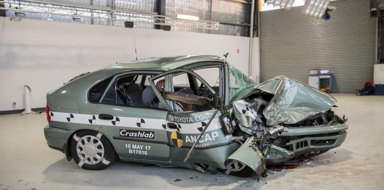 The new-versus-old crash test made such an impact – literally and metaphorically – that one of the media guests in attendance, a photographer, decided to sell his Nan’s late 1990s Corolla before lab technicians had started sweeping the shattered glass from underneath the two mangled cars.