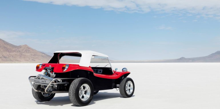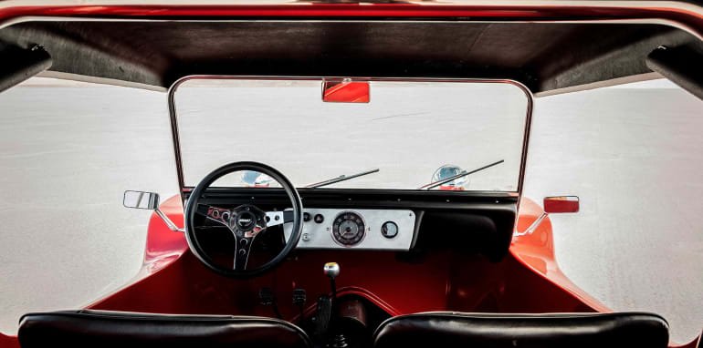 Meyers was inspired. Using his boatbuilding knowledge (and in particular fibreglass fabrication skills), Meyers utilised a shortened Volkswagen Beetle chassis, draped in his own-design reinforced fibreglass unibody, designed to resemble the hull of a boat, providing not only structural integrity, but also its now-iconic look. While Meyers retained the engine and transmission of the donor car, he uprated the Beetle’s rear suspension, using the rear trailing arms from an old Chevy pick-up.