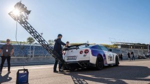 Preparing to film a race sequence with Cox’s Nissan GT-R.