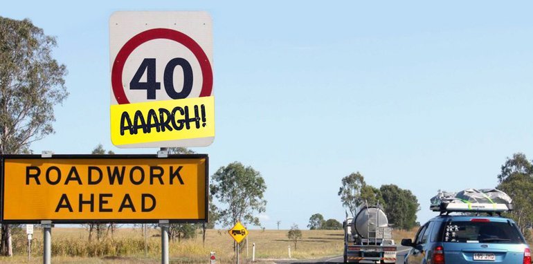 Calm down. I am not advocating we barrel freely through clumps of hard-working road-crews at 200km/h. My chakras are fully aligned with the Occupational Health & Safety concerns of the plant operators and lollipop champions. They do great and good work. And yes, when there are men digging holes and laying down hot-mix inches from moving cars, then everyone should slow the hell down and be cool.