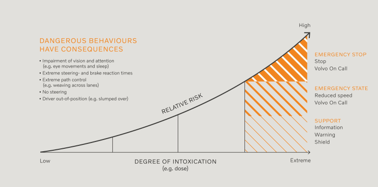 In-car technology will take control when drunk drivers are acting dangerously, as Volvo looks to end deaths and serious injuries in its cars.