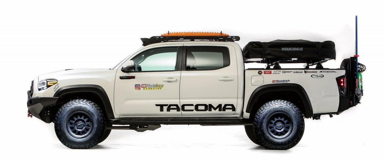 The Tacoma was reworked in consultation with 4WD Toyota Owner Magazine editors and features a Magnuson supercharger along with bikes, kayaks and gear for camping and hiking.