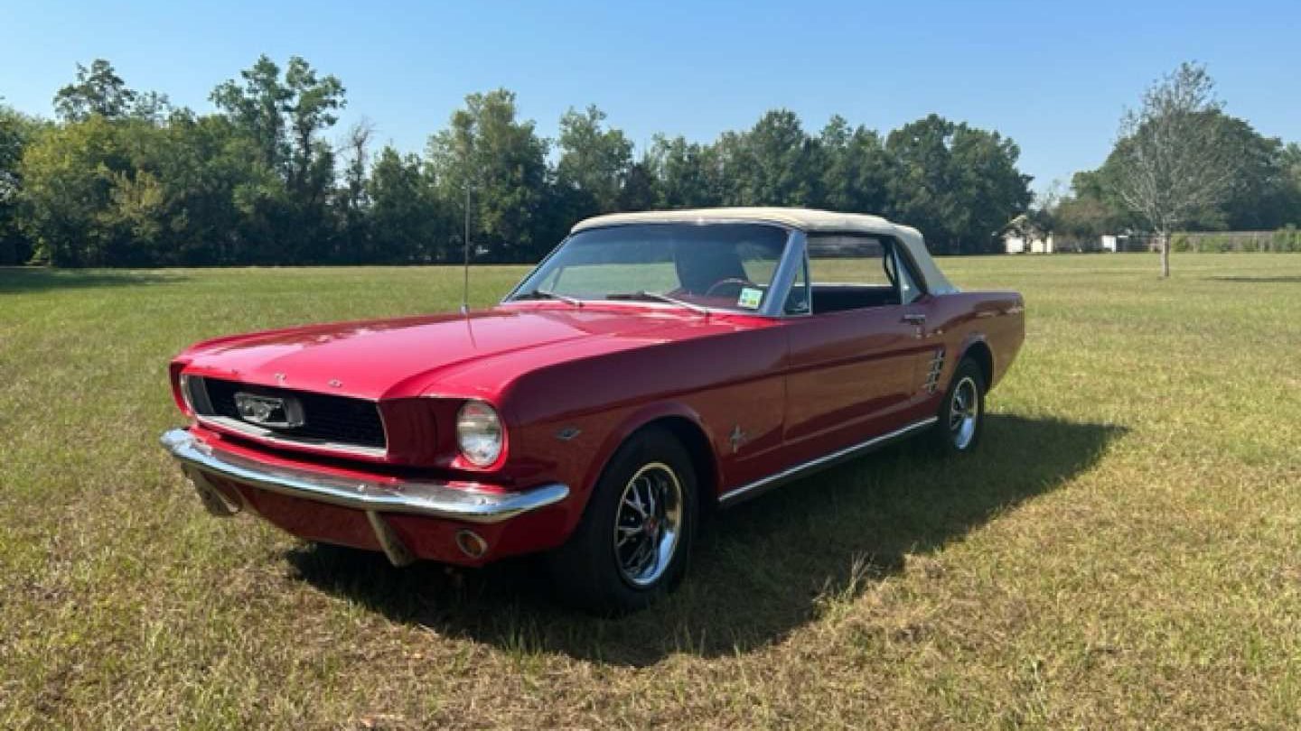 • 1966 Ford Mustang convertible: The original pony car, drawing power from a desirable A-code 289cid V8 engine and a four-speed manual transmission. The listing says that the tires are new, and options include a power-retractable top, styled steel wheels, a dual exhaust system, and power steering. The first-generation Mustang is a fan favorite for good reasons, and this car would make a great addition to any Ford enthusiast’s collection. It will be shown on Saturday as lot S583.