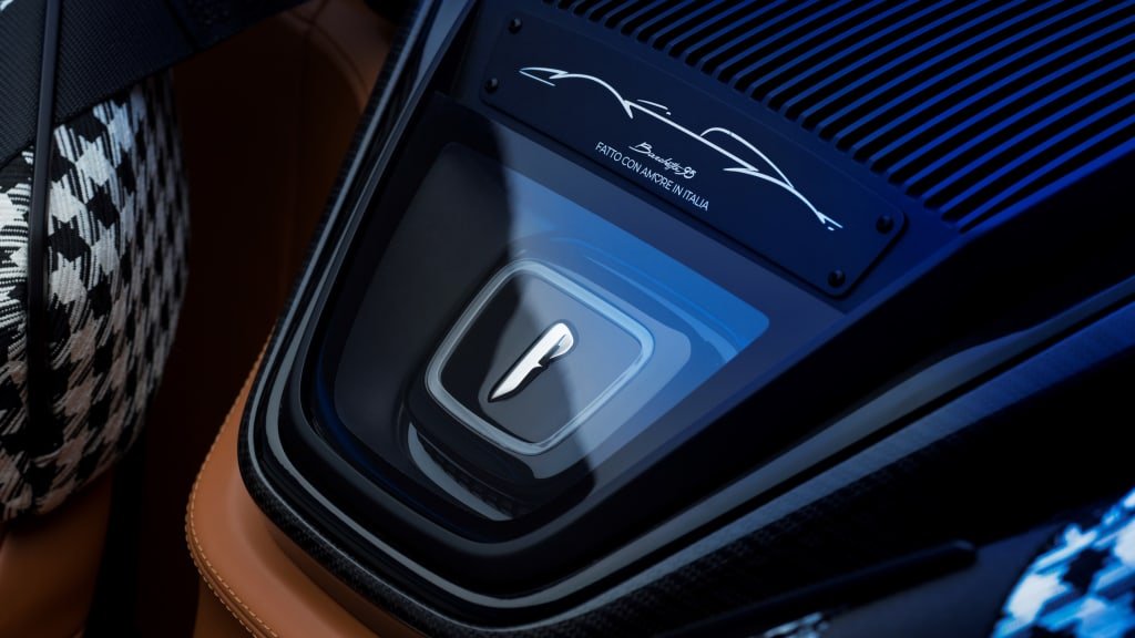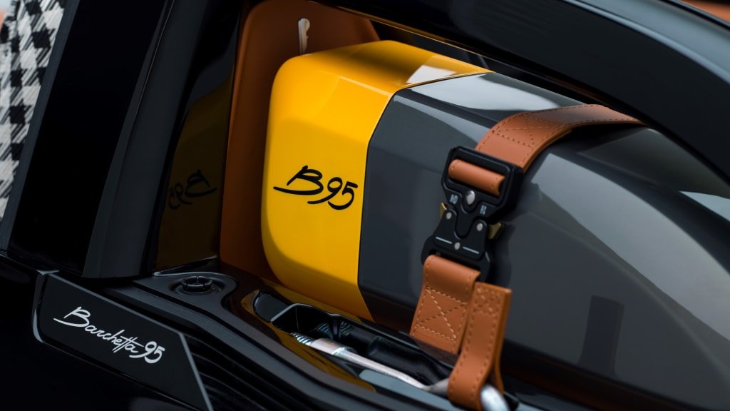 Inside, the carbon-fibre dashboard features beside tan-coloured leather and ‘Pied de Poule Houndstooth’ textile upholstery, adorned with bespoke B95 embossing.