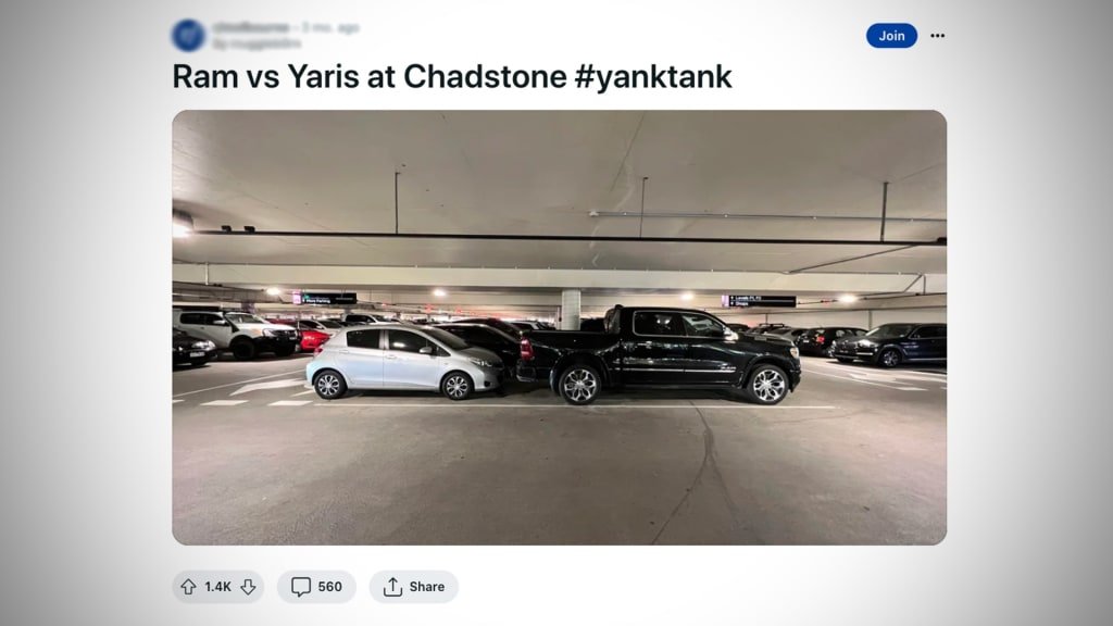 Another Reddit post features a photo of a Toyota Yaris parked next to a Ram 1500 captioned: “Ram vs Yaris at Chadstone”.